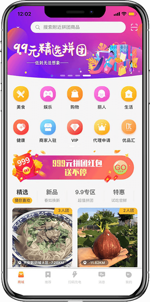 精准推送、抢红包拼团、短视频拼团、游戏拼团、让消费者体验吃喝玩乐购的乐趣